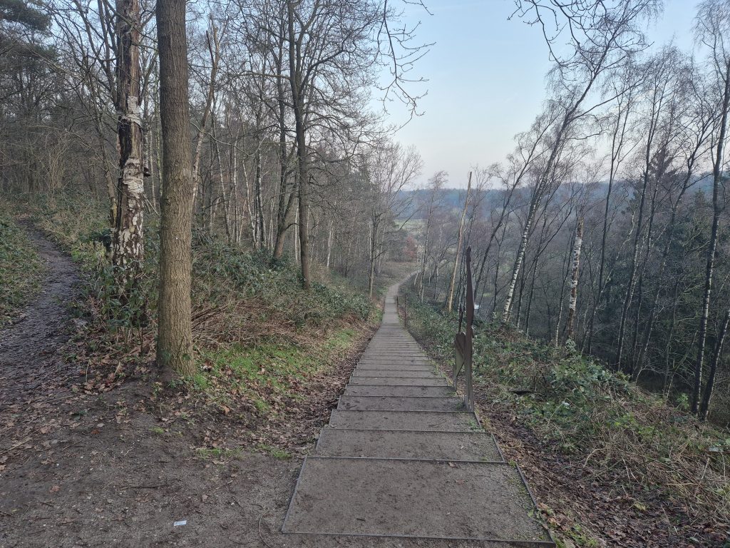 Eenmaal op het hoogste punt aangekomen ga je via een bijzondere trap weer naar beneden naar de bodem van de zandgroeve. Op de trap staat aangegeven wat er allemaal gebeurde in dit bijzondere natuurgebied. Door het dal loop je naar de andere kant waar je weer een steile heuvel moet beklimmen.